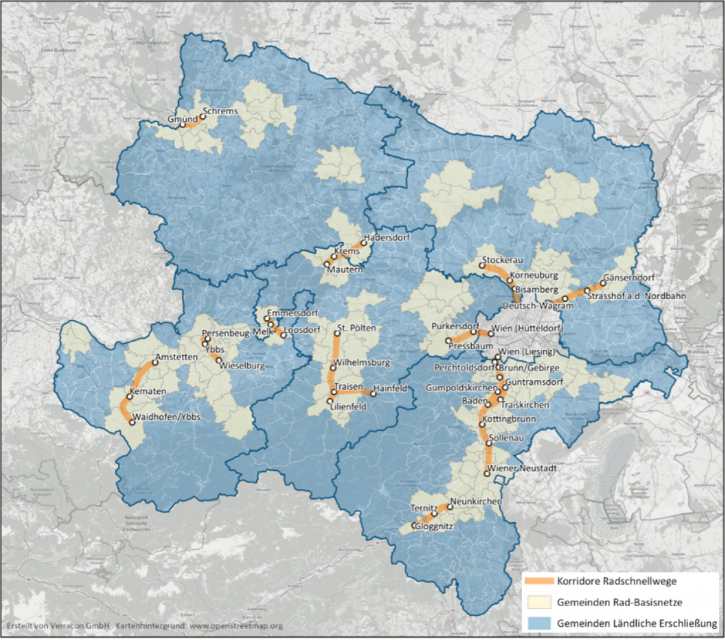 Eine Übersicht über die Förderung für Rad-Basisnetze und die ländliche Erschließung finden Sie online im NÖ Atlas. Blau dargestellt sind Regionen, in denen die Förderschiene B „Ländliche Erschließung – Radwege“ zur Anwendung kommt. Gemeinden ohne blaue Färbung fallen in die Kategorie der Rad-Basisnetze.